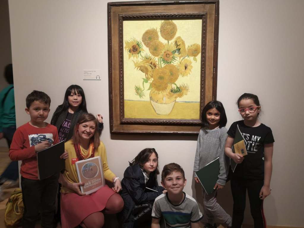 Jestem artystka, inspiratorka, historykiem sztuki i od 2012 prowadzilam zajecia kreatywne dla dzieci w szkolach i instytucjach kultury w Londynie. Na zdjeciu powyzej widzicie mnie odwiedzajaca wystawe Vincenta Van Gogha w Tate Britain wiosna 2019 z grupa dzieci. Oprowadzilam tam okolo 300 mlodych ludzi (5-10 letnich), opowiadajac o roznych aspektach tworczosci Van Gogha, rysujac, wyklejajac i aktywnie podziwiajac jego oryginalne obrazy.